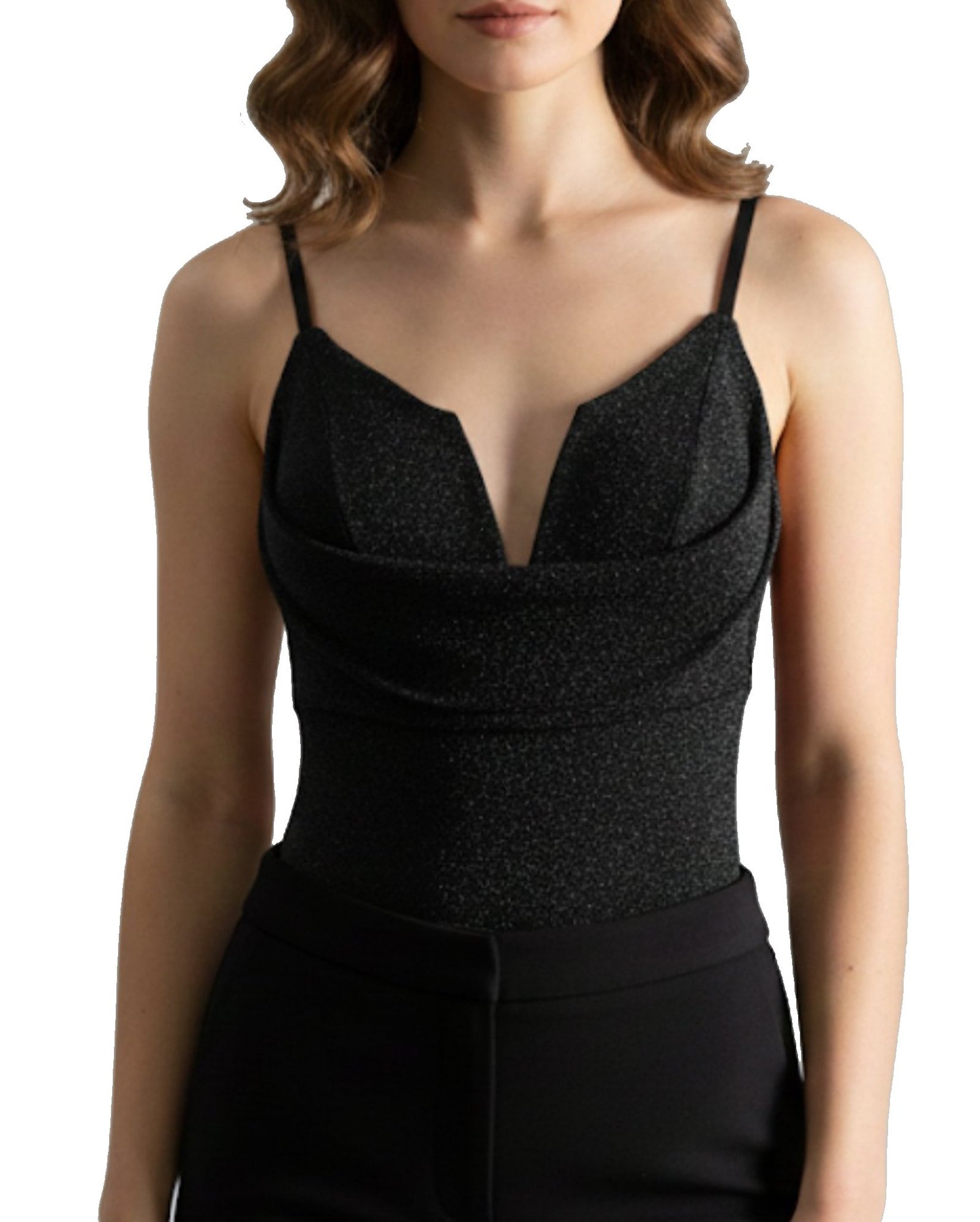 Este body cuenta con tirantes finos y un escote diseñado para realzar la figura. El toque final lo da el acabado glitter. Imprescindible en tu armario de fiesta.