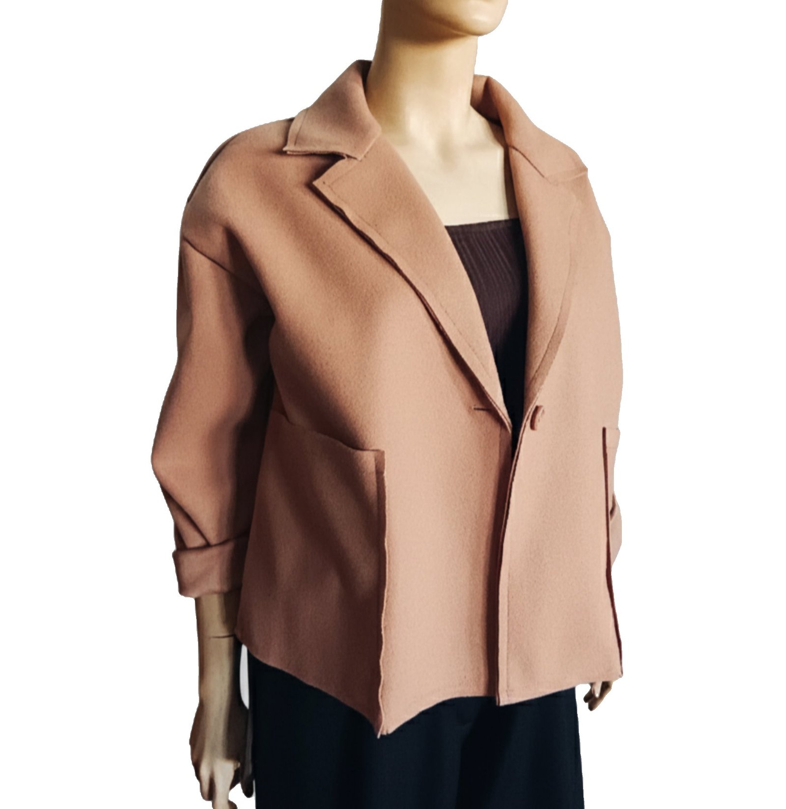 Chaqueta de líneas limpias y diseño minimalista que destaca por su silueta relajada y moderna. Confeccionada en un paño suave. Incorpora bolsillos grandes que aportan un toque funcional sin perder armonía. Su cierre frontal con un solo bolsillo y su caída suave le otorgan una elegancia discreta perfecta para completar looks contemporáneos con estilo y comodidad.