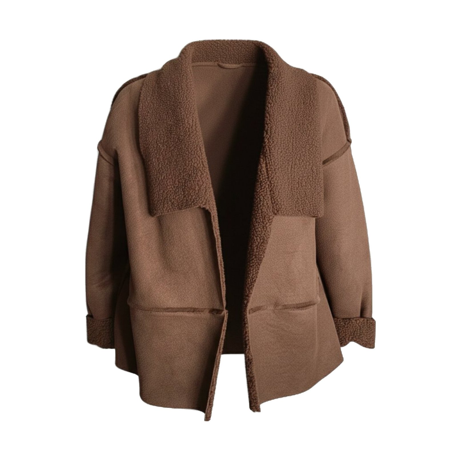 Esta chaqueta presenta un cuello de solapa ancho y voluminoso en tejido suave de tipo borreguito. El resto de la prenda tiene una textura más lisa y estructurada con texturas expuestas que añaden un toque moderno.