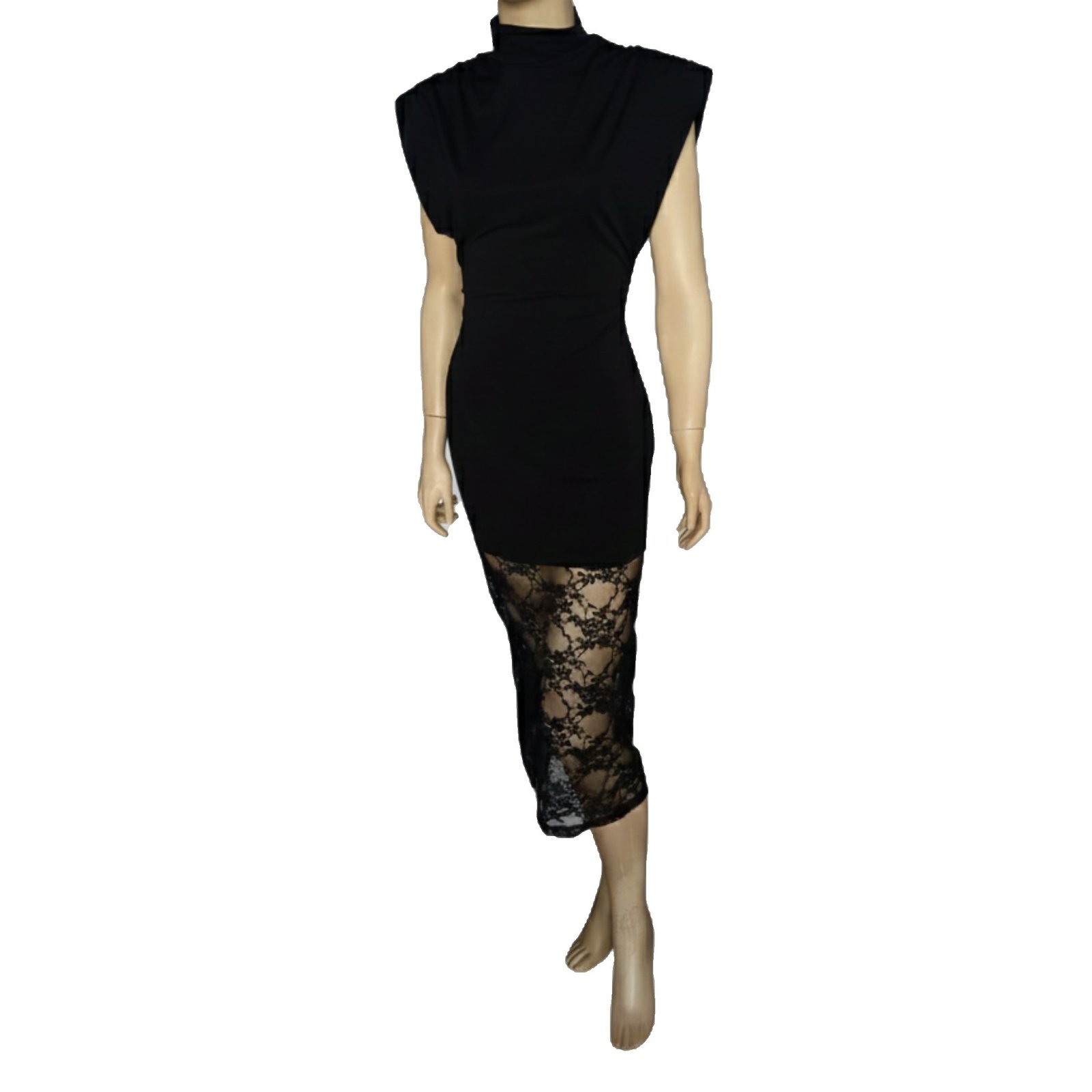 Saca tú lado más sofisticado con este vestido. Confeccionado con tejido elástico de alta calidad que se ajusta a la figura. El broche de oro es el delicado encaje en el bajo que añade un toque romántico y sutilmente transparente.