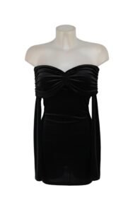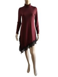 Vestido drapeado asimétrico de manga larga. El tejido elástico de alta calidad se ajusta perfectamente, mientras que el fruncido estratégicamente colocado realza la figura de manera sofisticada. Su característica más llamativa es la cola que cae desde la cadera creando un estilo mini-maxi.