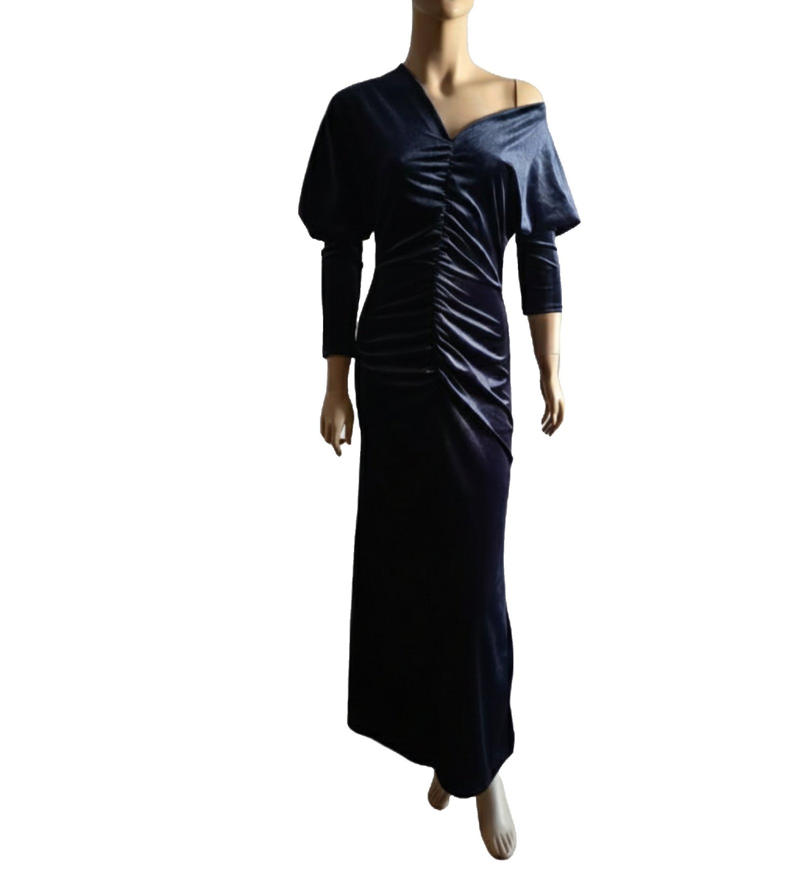 Este bonito vestido largo está confeccionado en un lujoso tejido de terciopelo que realza la silueta. El diseño presenta un elegante escote y manga larga tipo murciélago. La característica principal es el drapeado central que recorre el torso, creando un efecto fruncido y ultra-favorecedor que define la cintura.
