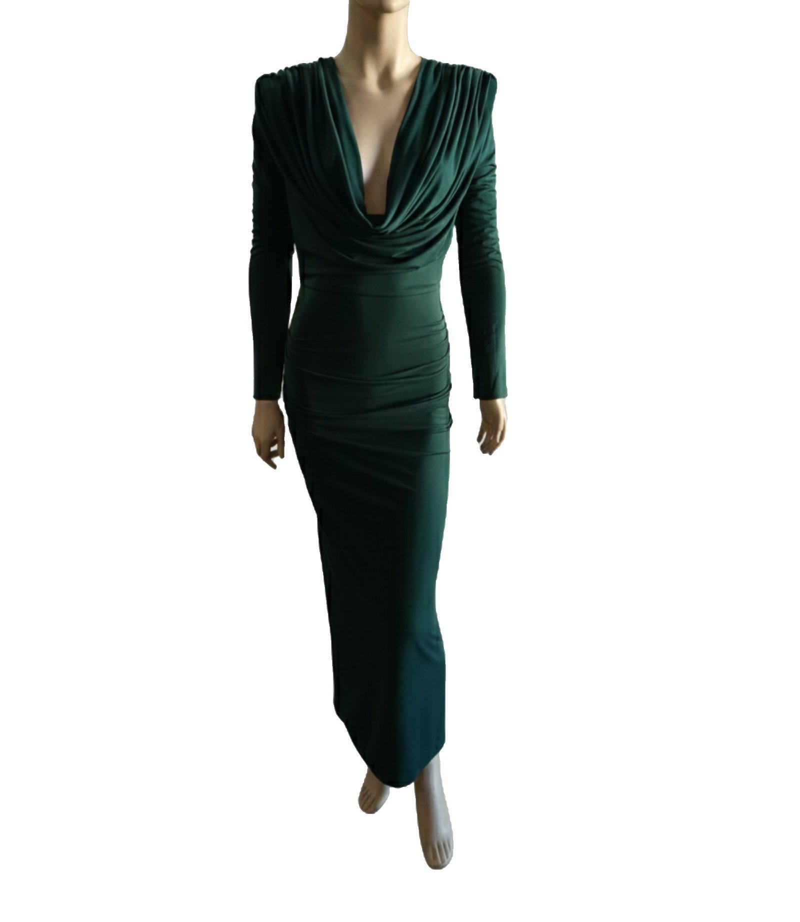 Una pieza diseñada para el máximo impacto. Este vestido está confeccionado en tejido elástico que esculpe la silueta. Sus hombros estructurados y acolchados añaden una sensación de poder y audacia. De manga larga y un escote espectacular en cascada.