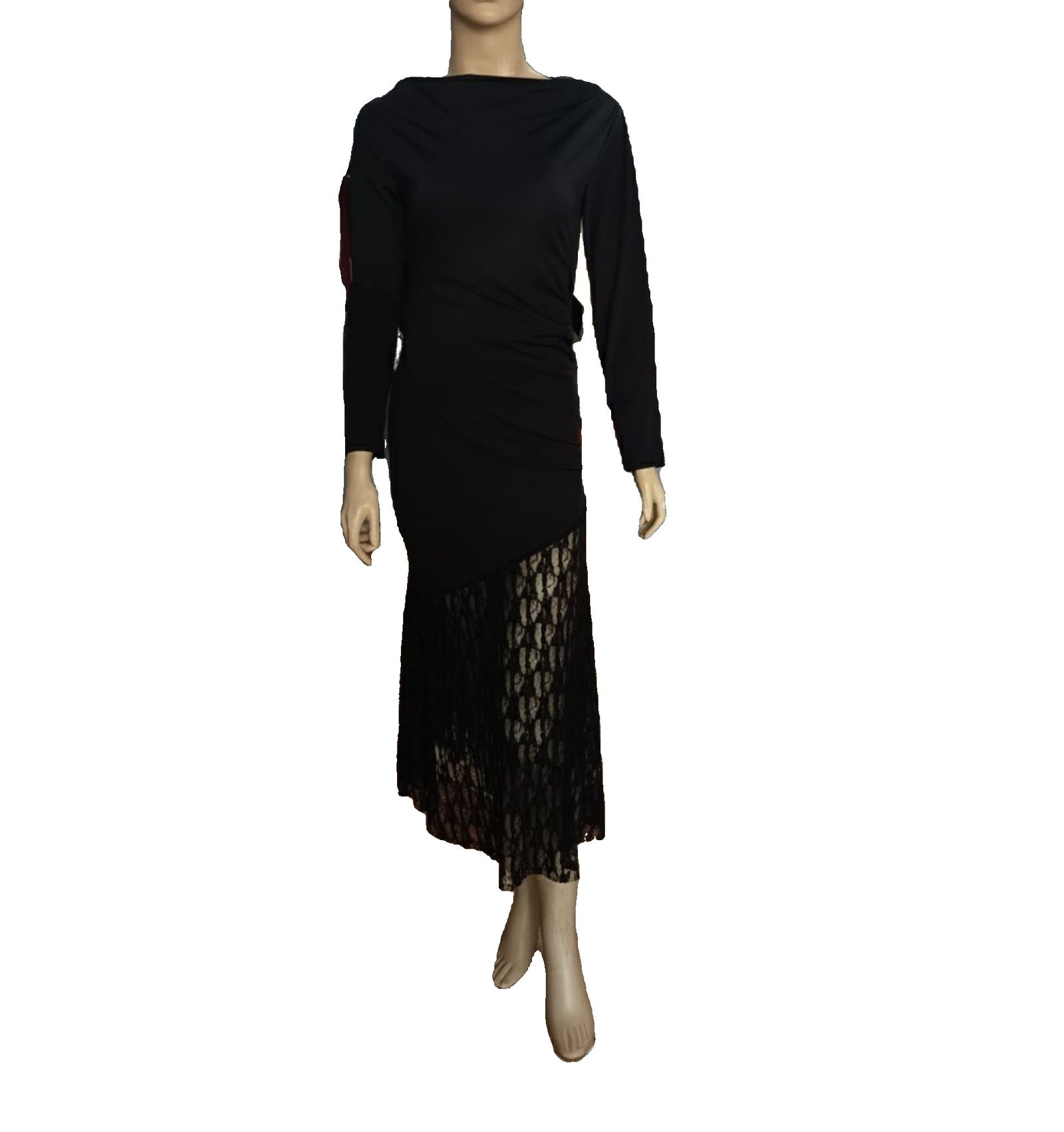 Elegante vestido de cóctel con escote barco. Confeccionado en licra y de manga larga. Tiene corte diagonal a la altura de la rodilla donde comienza el encaje floral.